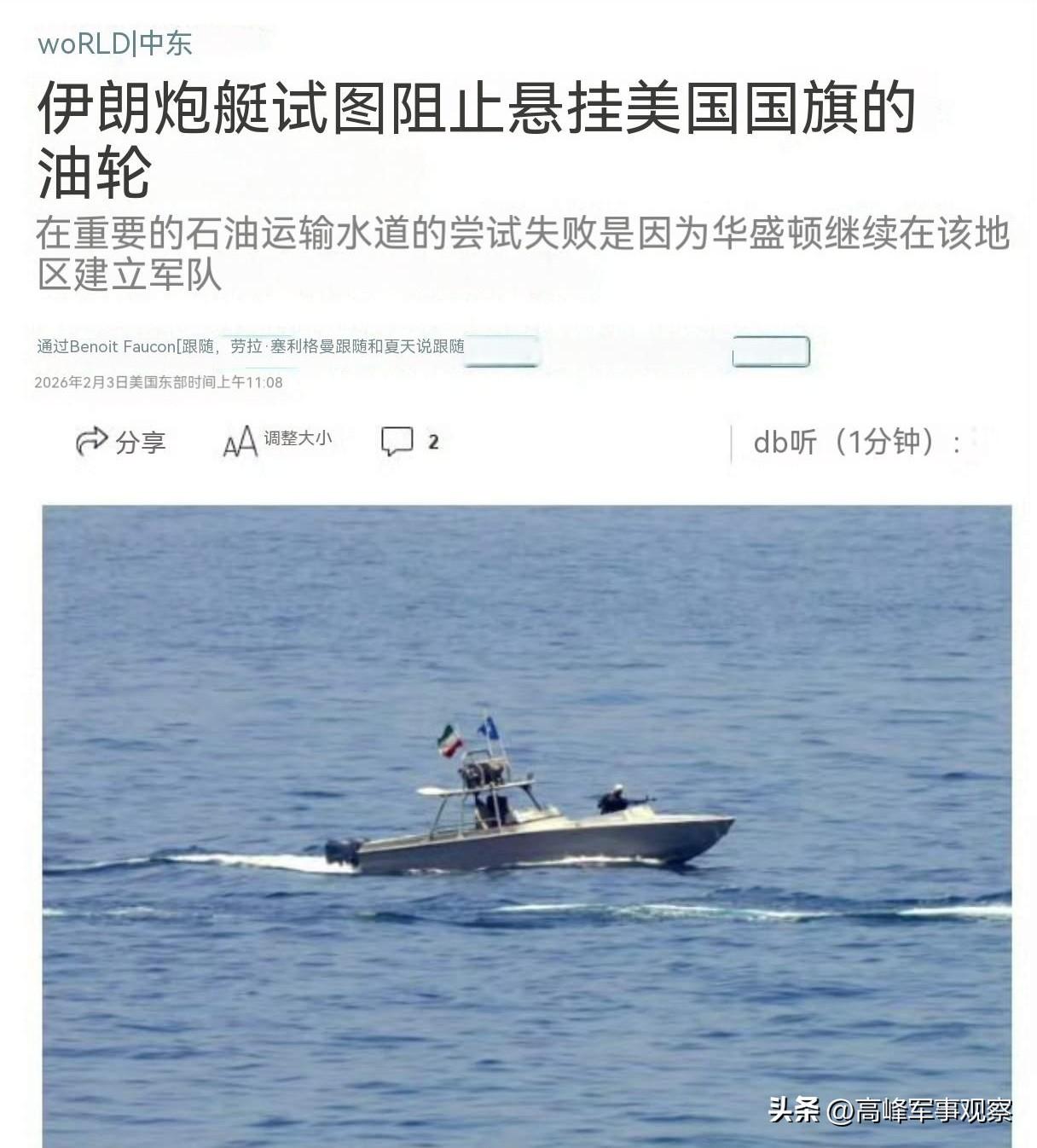 伊朗第二個反應動作是,在霍爾木茲海峽向美國發出實質性警告。當天,美國《華爾街日報》證實,伊朗炮艇在霍爾木茲海峽接近一艘美國油輪,並命令其停船準備登船檢查。但該油輪非但未停船,反而加速行駛,隨後在一艘美國軍艦護航下安全脫險。表面上看,伊朗快艇“狼羣”扣押美國油輪失敗了,實際是在直接警告美國人:霍爾木茲海峽是伊朗人的“主場”,可以隨時封鎖海峽切斷中東油路。