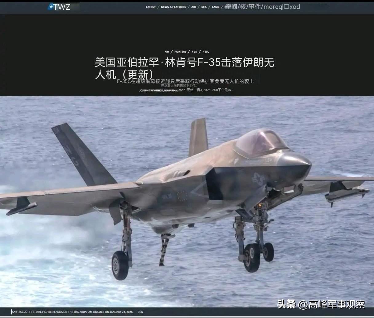 波斯灣和阿曼灣又經歷了心驚肉跳的一天。2月3日,對於頻繁抵近偵察美國“林肯號”航母戰鬥羣的伊朗偵察無人機,美國軍方忍不住下令開火擊落!美媒報道稱,美國海軍“林肯號”航母出動了F-35C艦載戰鬥機,擊落一架持續監控美國海軍航母戰鬥羣的伊朗“沙赫德-129”偵察無人機。美國中央司令部發布消息稱擊落一架伊朗無人機,並強調“絕不容忍來自伊朗的任何威脅”。