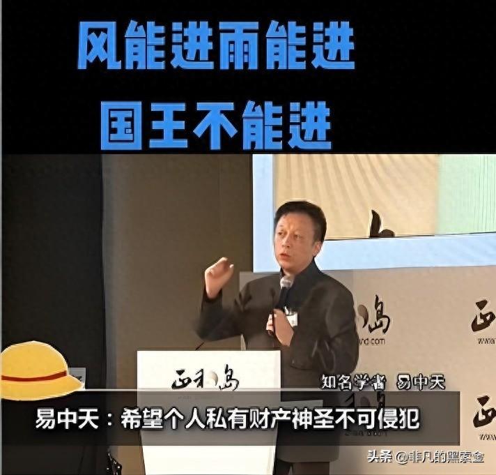 2013年,著名學者易中天在北大演講時,爲了彰顯西方“私人財產神聖不可侵犯”,說了一句“風能進、雨能進, 國王不能進”,並以此來標榜西方的人權保障,但這完全是斷章取義、偷換概念。
