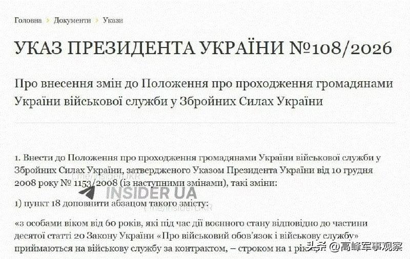 爲了舒緩兵員缺乏的問題,烏克蘭總統澤連斯基2月10日簽署總統令,對《烏克蘭公民在烏克蘭武裝部隊服役規定》作出修改。根據總統令規定,在戰時狀態期間,允許60歲以上人員在通過軍醫委員會體檢並獲得部隊指揮官書面同意的情況下,以合同方式服役,合同期限爲一年並可延長一年。修訂條款同時明確,如戰時狀態終止或取消,上述合同將提前終止,相關軍人依照法律規定退役。