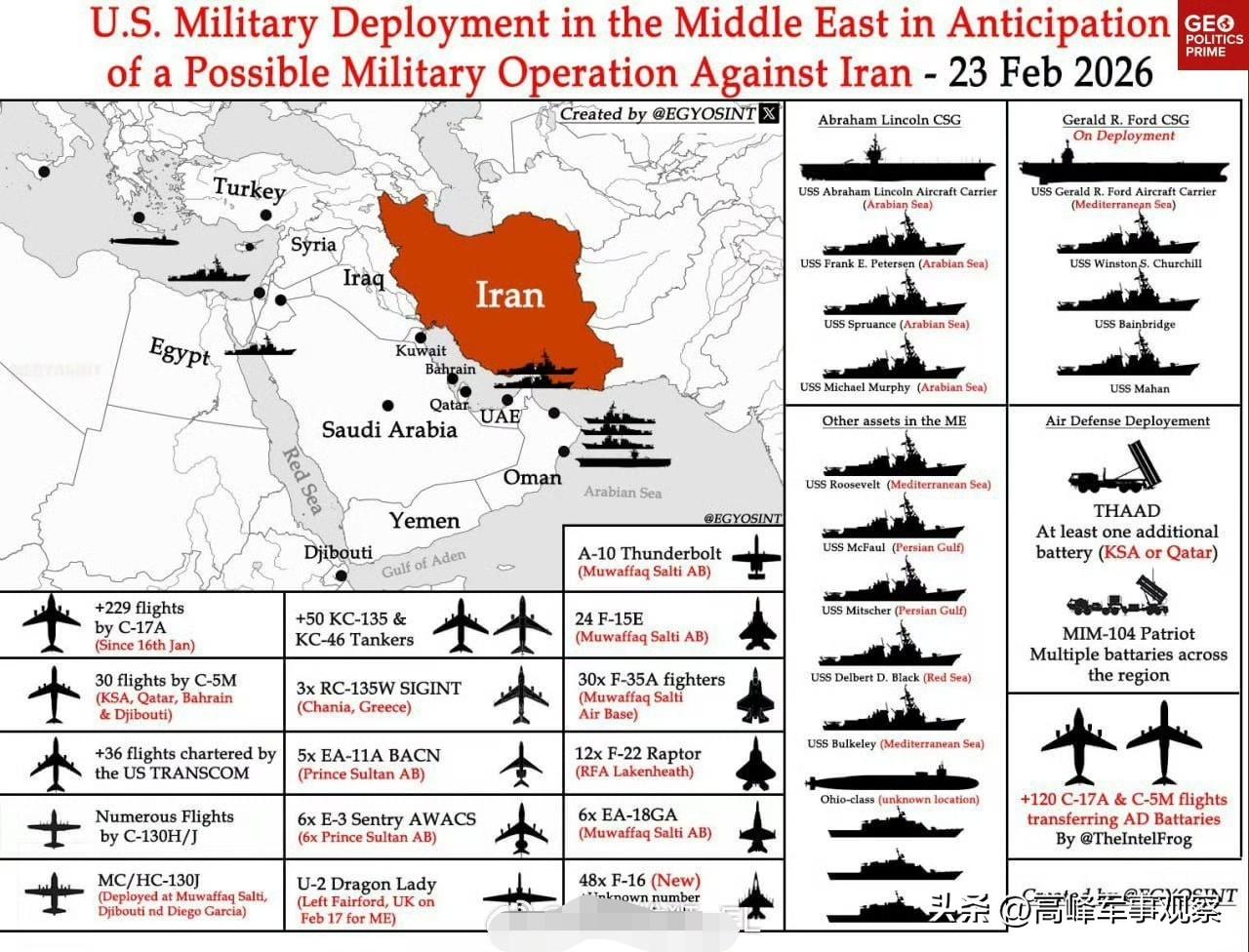 所以,2月26日的美伊談判結果不容樂觀,而且如果談不攏的話,當天很可能就是美軍軍事打擊行動的“D日”。截至目前,美軍在中東地區投入了兩個航母戰鬥羣,以及美軍在該地區的空軍力量。總共有209架空中加油機,可以爲大約500架戰鬥機提供戰鬥支持。根據軍事專家分析,美軍可以一次可持續出動500~800架次戰鬥機和數百枚巡航導彈,對伊朗境內縱深目標實施打擊。