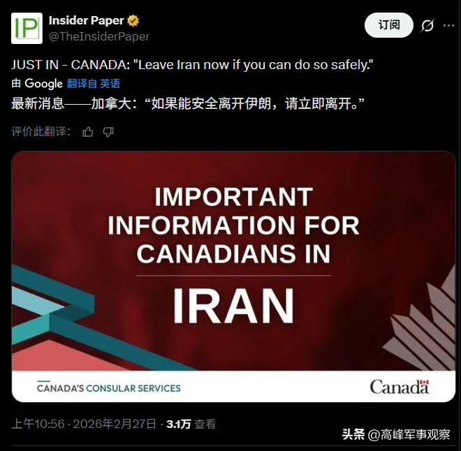 美國海軍中將弗雷德·卡徹被免職,意味着美國軍方和白宮鐵了心要對伊朗動武。但這次伊朗也準備“硬碰硬”。伊朗塔斯尼姆(通訊社)報道稱:72% 的伊朗人反對以停止導彈技術發展作爲防止美國可能發動軍事襲擊的手段。69.5% 的人認爲伊朗人民有能力抵抗可能發生的戰爭和美國的軍事打擊。戰爭或不可避免,加拿大政府呼籲該國公民離開伊朗。