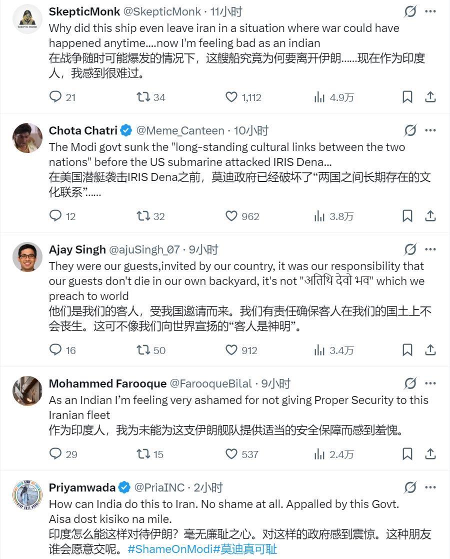 印度網友紛紛指責莫迪當局,以友誼爲藉口要求伊朗海軍前來演習,然而美伊衝突爆發之後,卻不爲伊朗軍艦提供安全保障和安全通道,在伊朗軍艦遇襲後,自詡印度洋霸主的印度甚至連援助都不提供,反而是小國斯里蘭卡全力搜救。印度網友表示,作爲一個印度人,爲印度未能保護伊朗軍艦而感到羞愧,此舉毫無廉恥之心,是印度的巨大恥辱。