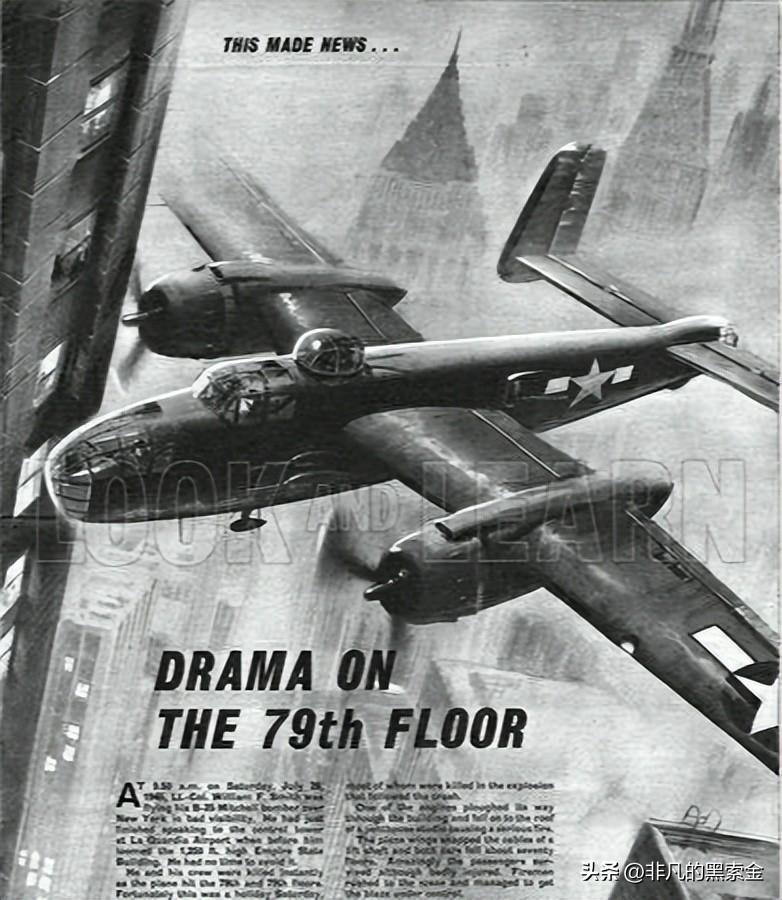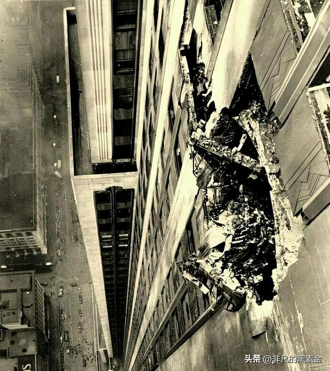 一架美軍B-25D型轟炸機以每小時320英里的速度,撞進了大廈的第79層。一個引擎飛了出去,將對面的樓頂砸出了一個大洞。3名機組成員和正在樓裏辦公的11人遇難。