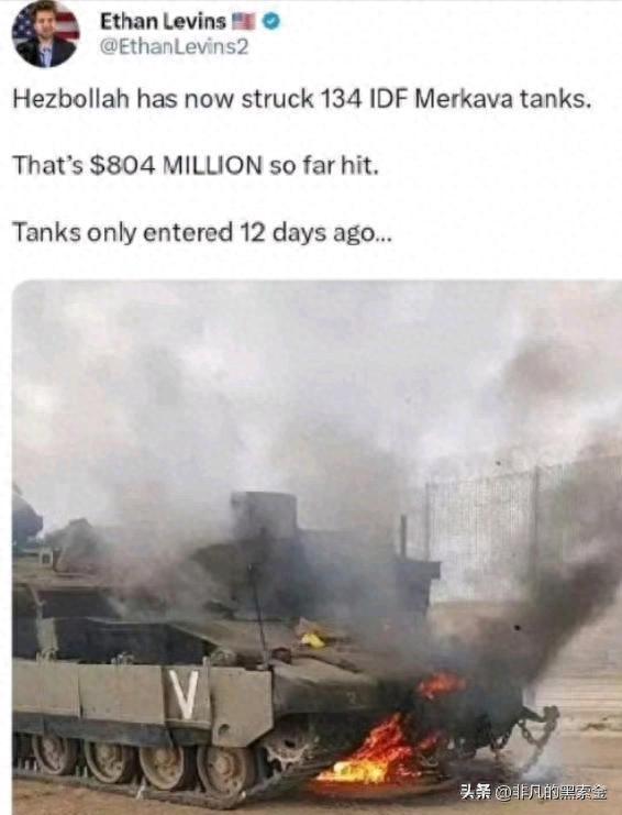 美國記者伊桑·萊文斯發文稱,以色列軍隊最近12天在黎巴嫩邊境共損失了134輛梅卡瓦坦克,估計高達8.04億美元。其中僅3月26號一天就損失了21輛。