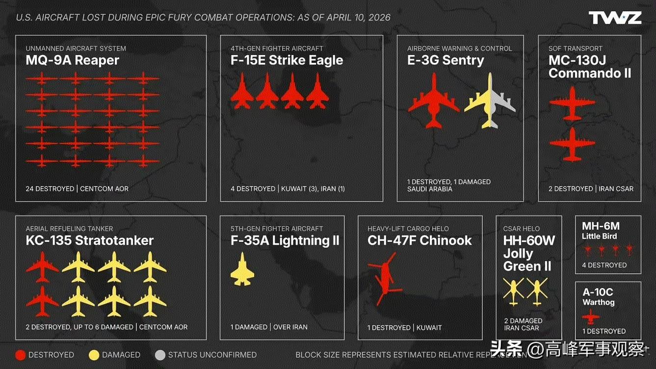 正常情況下,戰爭損失分兩個重要部分,一部分是軍事裝備損失,一部分是人員損失。這次美國權威軍事媒體“戰場”雜誌(TWZ)揭露的是美軍的軍事裝備損失情況。TWZ的統計圖表顯示,從戰爭爆發至今,美軍共損失24架MQ-9無人機,8架KC-135空中加油機,4架F-15E戰鬥機,1架F-35戰鬥機,2架E-3G預警機,2架MC-130J運輸機,1架CH-47F重型運輸直升機,2架HH-60W武裝直升機,4架MH-60M小馬直升機和1架A-10C攻擊機。