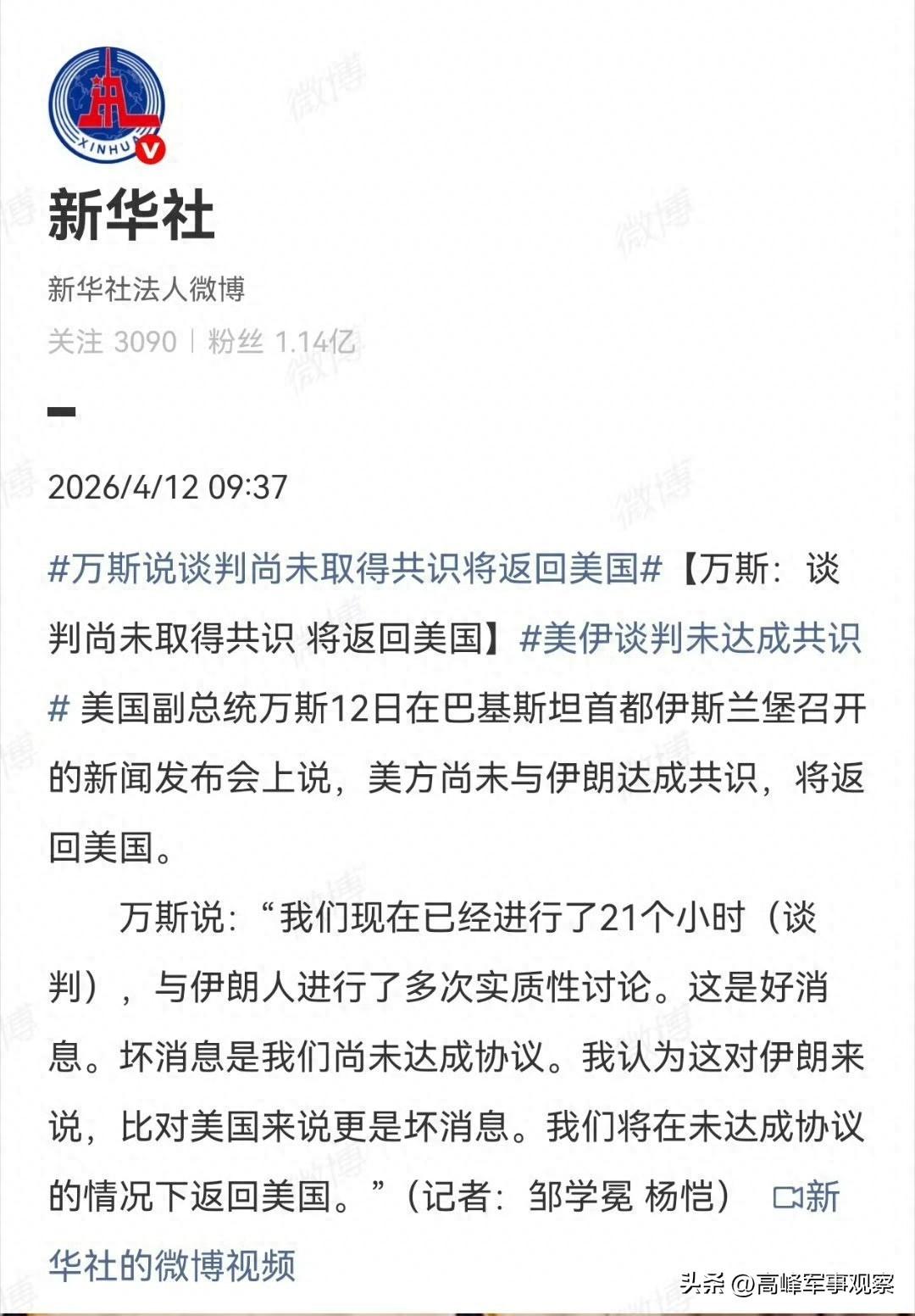 不出所料,美伊在伊斯蘭堡的談判沒有取得任何一點成果。作爲世紀矚目的戰爭談判,雙方代表團甚至沒有合影,更沒有召開聯合記者會。新華社的消息稱,伊朗代表團已經離開巴基斯坦。美國副總統萬斯的兩架空軍2號專機也已返回華盛頓。在記者會上,萬斯幾乎把談判失敗的所有責任都推給了伊朗。萬斯宣佈:美伊談判破裂——“未達成協議,伊朗不接受美國的方案”。