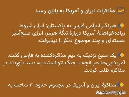 伊朗法爾斯通訊社駐巴基斯坦記者報道稱:伊朗拒絕了美國關於霍爾木茲海峽、和平核能及其他若干問題的全部過分要求。一位接近伊朗談判團隊的消息人士告訴法爾斯通訊社:“美國人將他們在戰場上未能得到的,都擺到了談判桌上作爲要求。”而美軍在韓戰、越戰中的歷史經驗可以確認,美國在戰場上得不到的,在談判桌上更加難以實現。