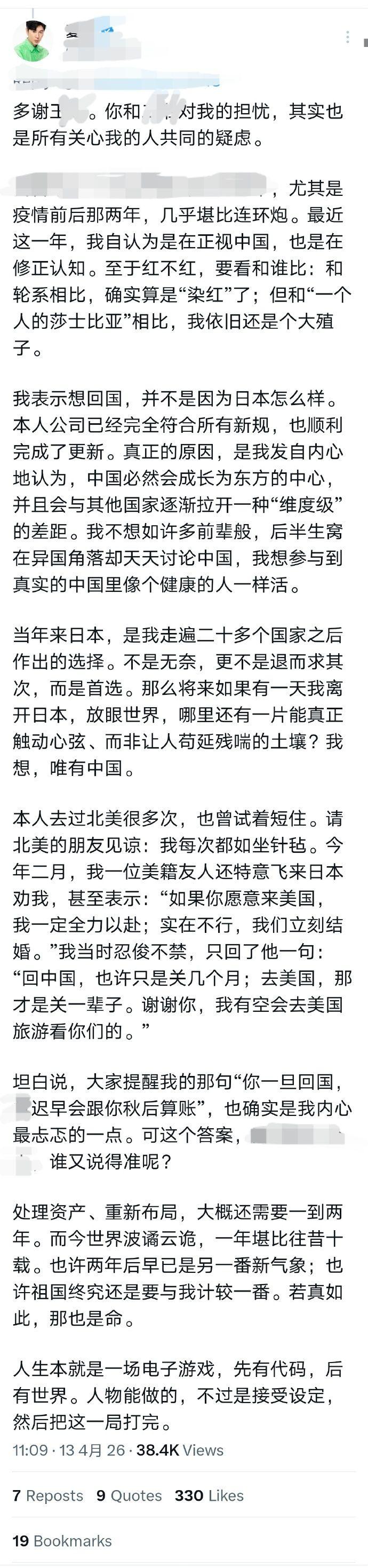 他還在帖子中透露:“本人去過北美很多次,也曾試着短住。請北美的朋友見諒:我每次都如坐鍼氈。今年二月,我一位美籍友人還特意飛來日本勸我,甚至表示:‘如果你願意來美國,我一定全力以赴;實在不行,我們立刻結婚。’我當時忍俊不禁,只回了他一句:‘回中國,也許只是關幾個月;去美國,那纔是關一輩子。謝謝你,我有空會去美國旅遊看你們的。’”
