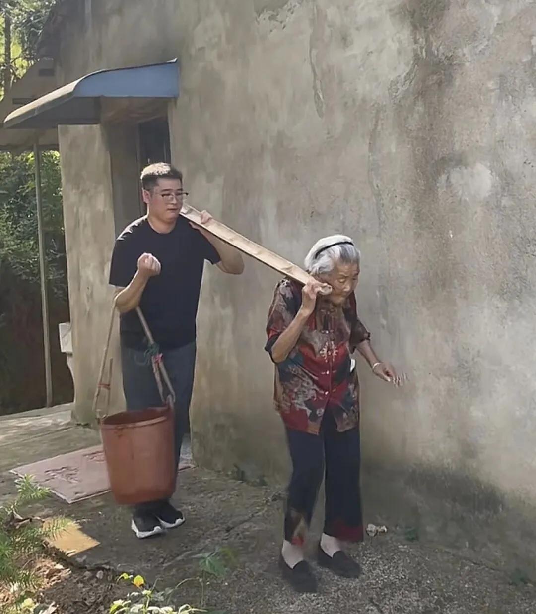 許昊一臉無奈:“自己的奶奶,只能寵着。”於是他一手扶扁擔,一手提水桶,陪着奶奶完成這場“勞動遊戲”。