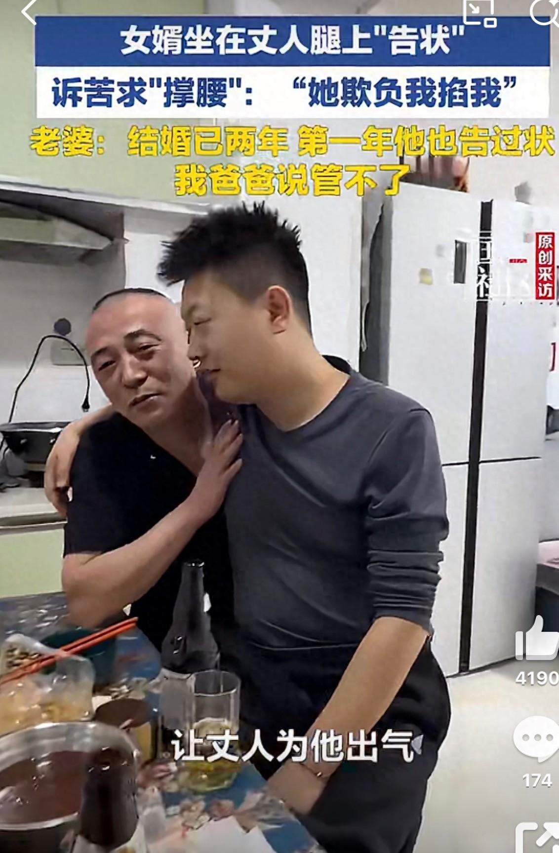 他跟老丈人訴苦說,妻子經常欺負他,讓他天天以淚洗面,說到動情處,還直接坐在老丈人腿上去了。
