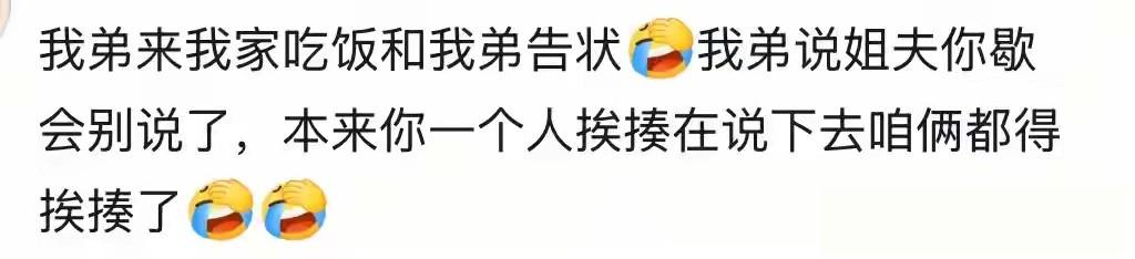 還有個更離譜的,小舅子去姐姐家喫飯。剛坐下,姐夫就拉着小舅子告狀。
