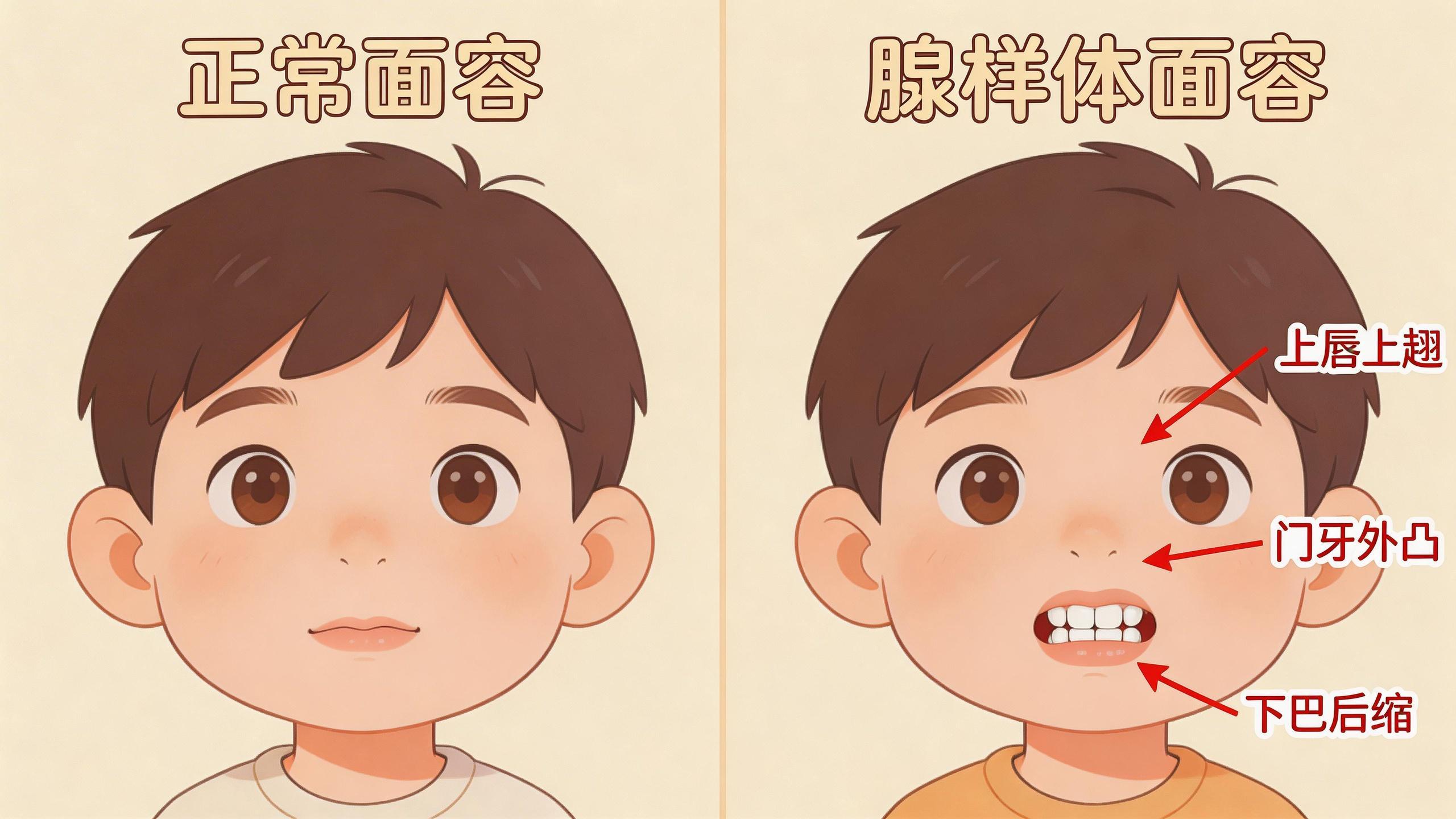 堵了以後,麻煩就來了。孩子會開始打呼嚕,而且是那種憋氣的呼嚕,睡着睡着呼吸停了、臉都憋紅了;白天鼻子不通氣,只能張着嘴呼吸,時間長了,嘴脣上翹、門牙外凸,臉蛋都變形了,這叫“腺樣體面容”;還會耳朵悶、聽力下降,甚至影響到身高體重、注意力和情緒。