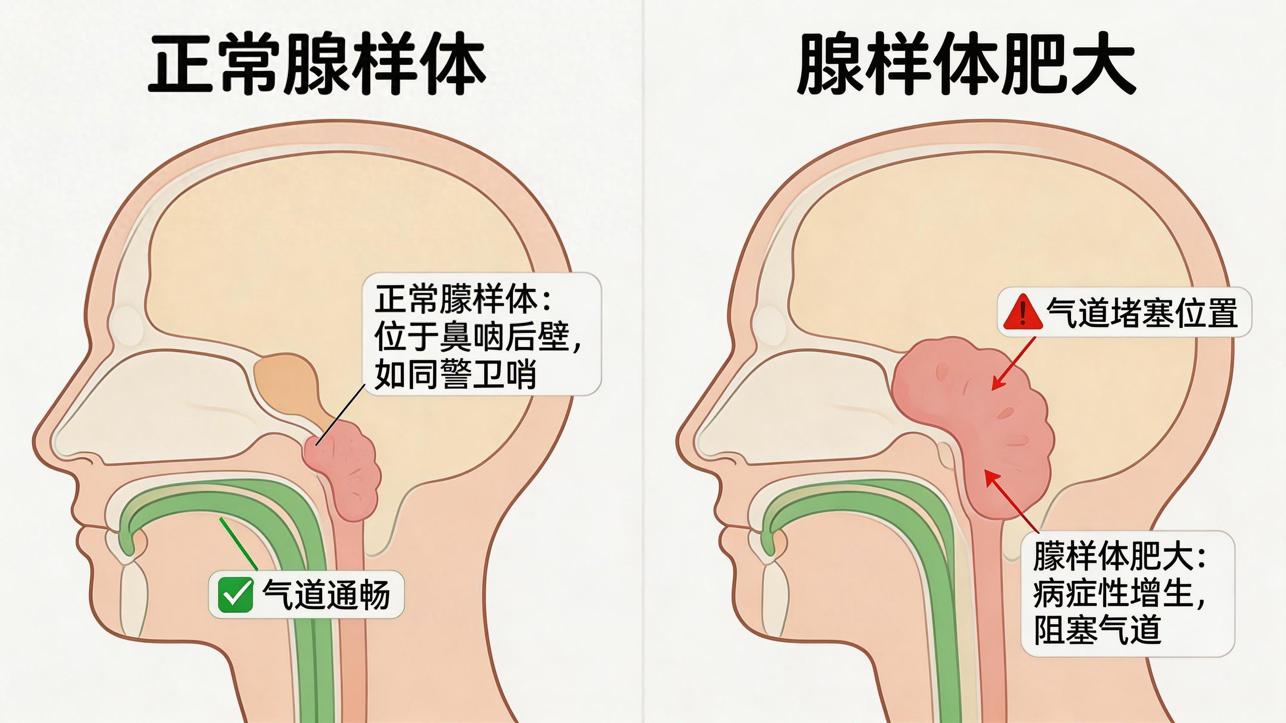 咱們先得明白,腺樣體是什麼。它就像孩子鼻咽部的一塊“警衛哨”,是正常的淋巴組織。通常2到6歲長得最旺,10歲以後慢慢就“退休”萎縮了。問題在於,反覆發炎刺激會讓它病理性增生,從“警衛”變成了“路障”,把鼻子通往後方的氣道給堵了。
