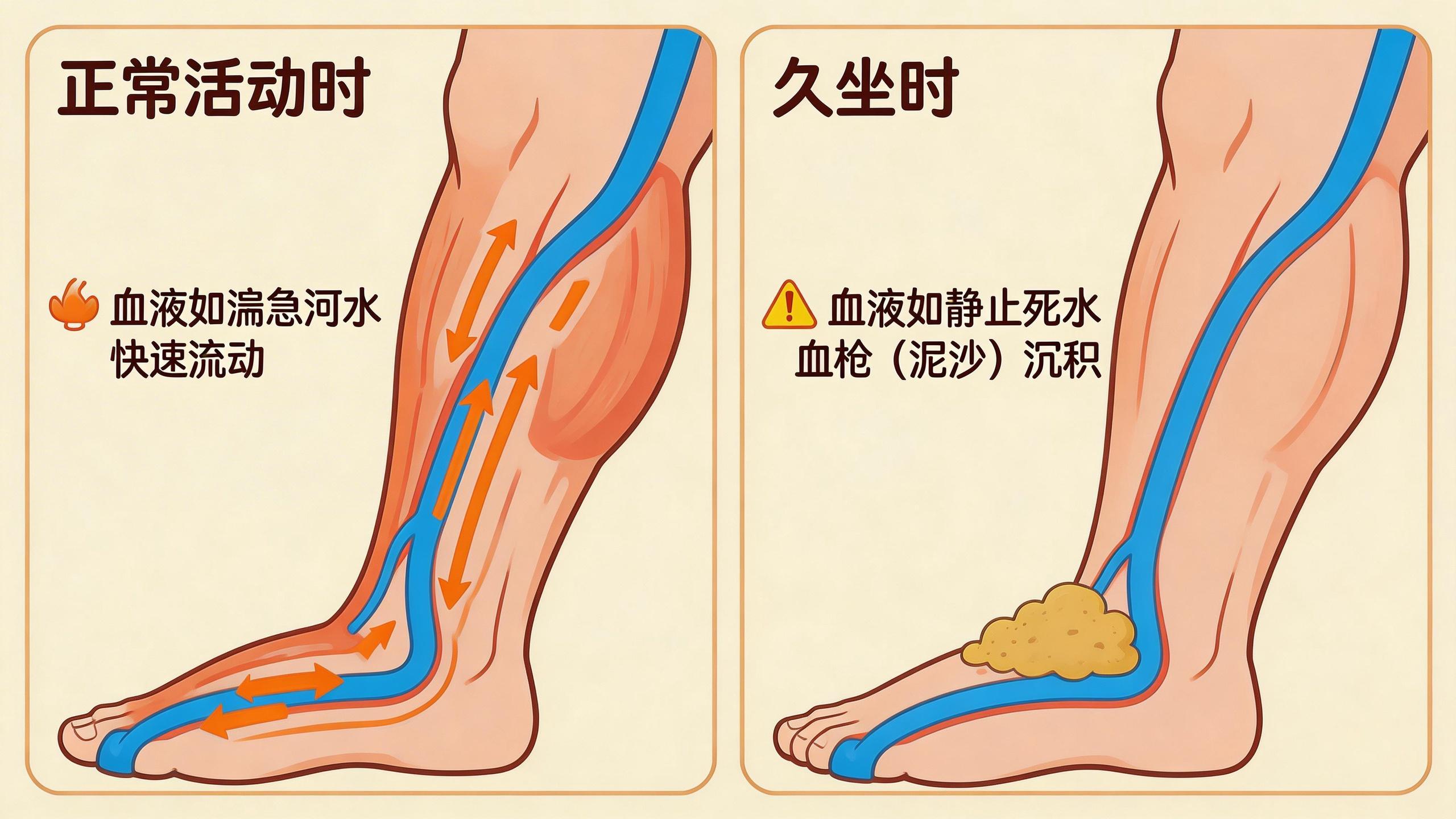 那麼,好端端坐着,怎麼會這麼危險呢?我們可以把腿部的血管想象成一條條河流。當我們活動時,肌肉的收縮就像泵一樣,幫助血液順暢地流回心臟。可一旦我們長時間靜止不動,比如窩在狹小的駕駛座或副駕上超過4個小時,這些“河流”的流速就會變得極其緩慢。臨牀研究觀察到一個數據:久坐時,腿部靜脈的血流速度可能會從正常的每秒約10釐米,驟降到只有2-3釐米。