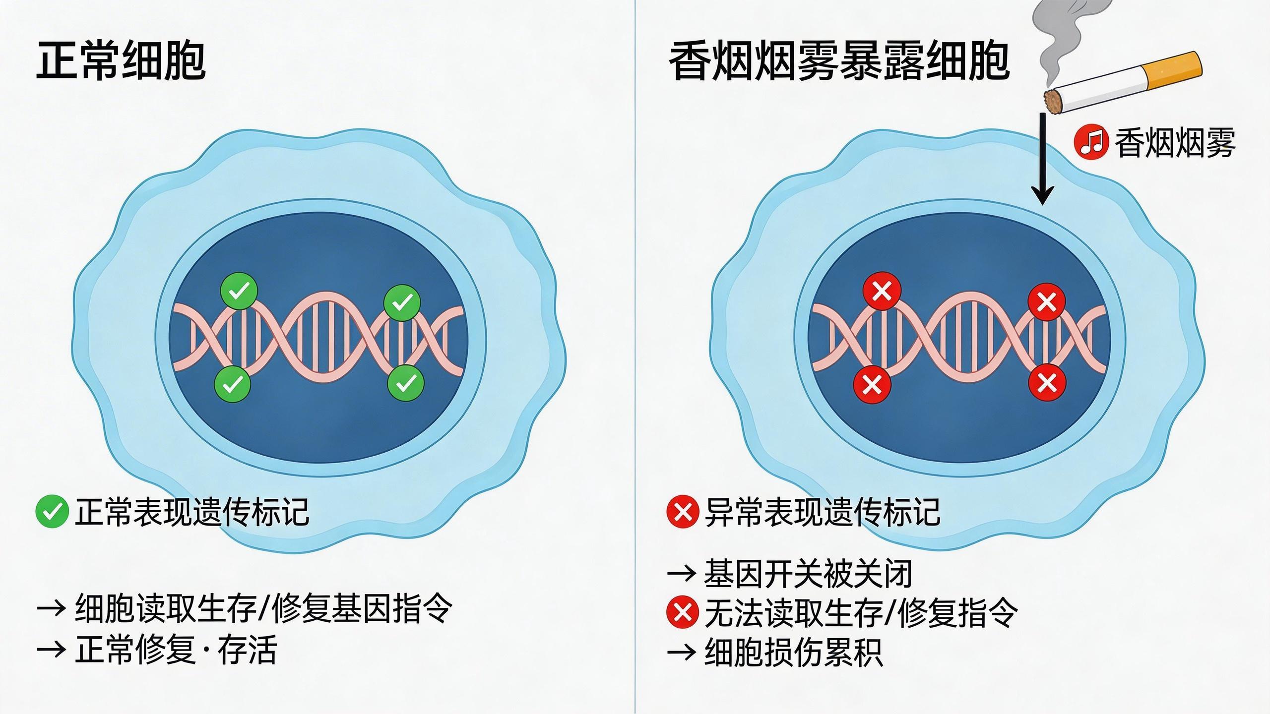 那麼,煙霧到底是如何給細胞的基因“上鎖”的呢?研究指向了“表觀遺傳改變”。這不像直接損傷DNA那樣劇烈,它更像是在基因的“開關”上貼了層便籤,讓細胞無法讀取某些重要的生存和修復指令。這種改變影響的是細胞最核心的幾條生命線,導致它們無法應對壓力,最終凋亡。最棘手的是,這種“上鎖”可能是一種長期甚至永久的改變,即便後來戒菸了,傷害也可能已經種下。