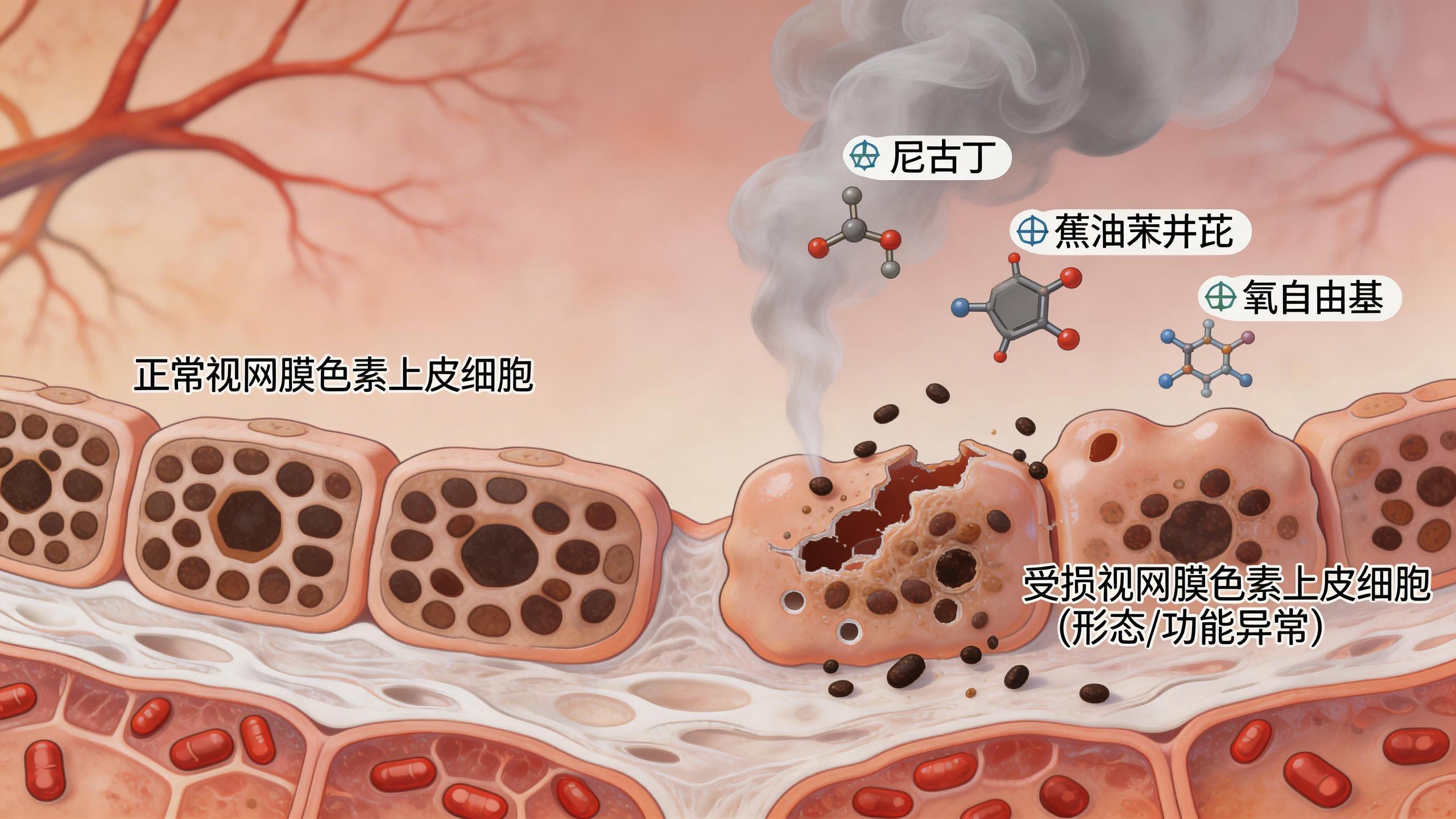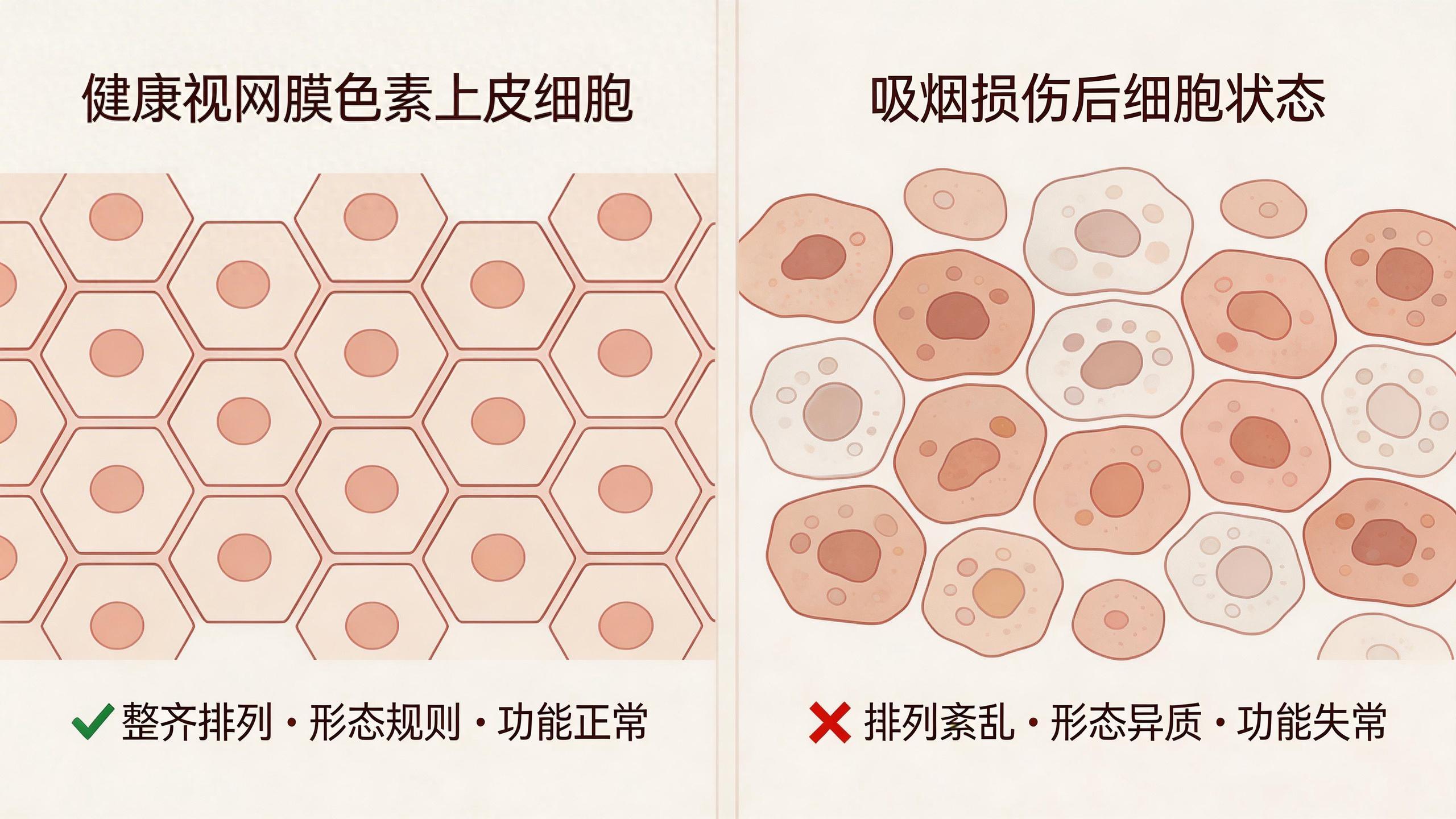 我們的眼睛後部有一層非常關鍵的細胞,叫做“視網膜色素上皮細胞”。你可以把它想象成眼睛裏兢兢業業的“後勤保障隊”和“清潔工”,它負責給感光細胞提供營養,並清理代謝廢物,是維持視力健康的基石。而這項研究通過精密的實驗發現,無論是短期接觸高濃度的香菸煙霧提取物,還是長期暴露在煙霧環境中,都會讓這支“保障隊”內部發生混亂。