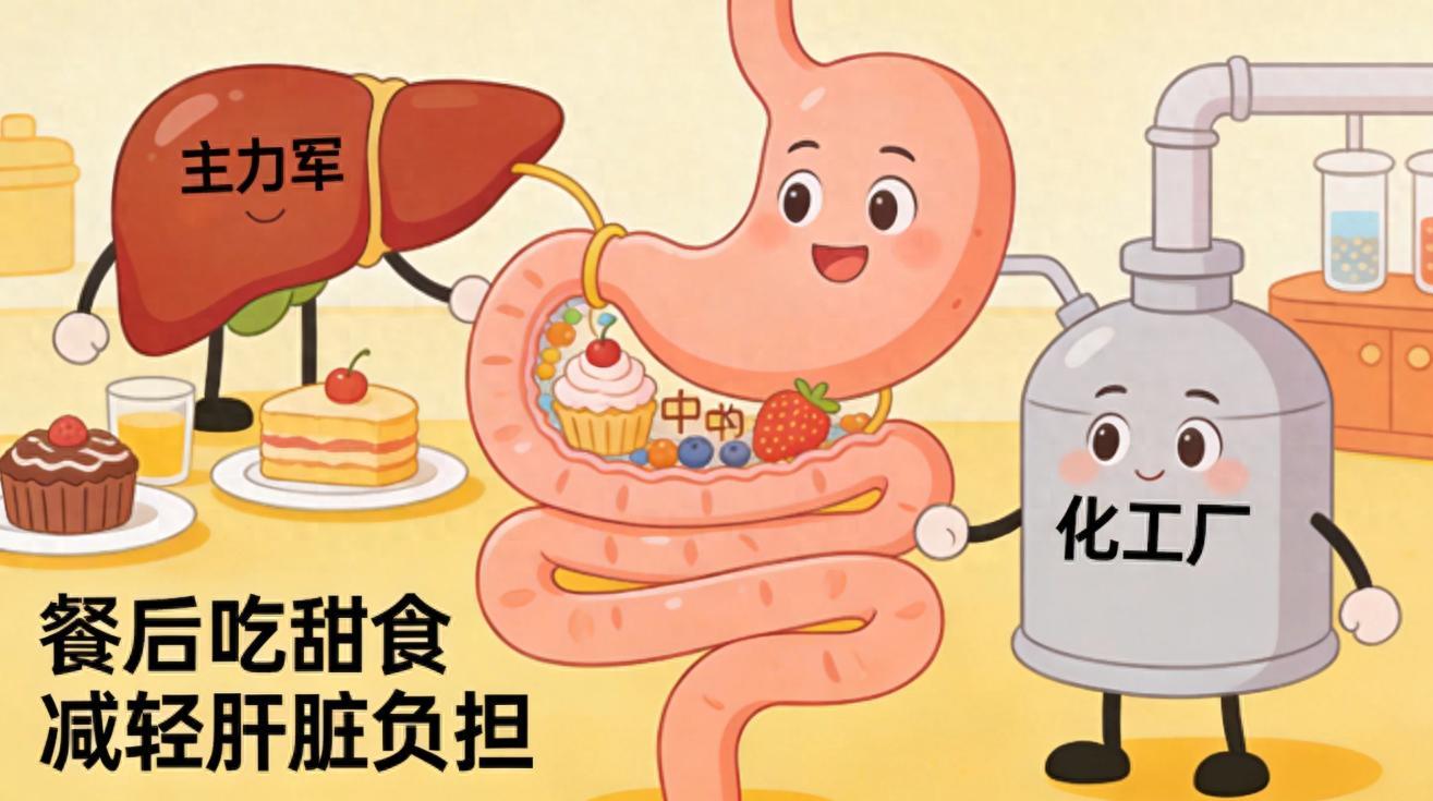 很多甜食、飲料中的甜味來源於“果糖”。果糖進入人體後的代謝路徑很特別:它主要由我們的小腸來負責轉化處理;只有當一次性攝入量過大,超過了小腸的工作能力時,多餘的部分纔會“轉交”給肝臟去代謝。在飯後,整個消化系統處於活躍的工作狀態,小腸處理果糖的能力會增強。餐後喫甜食,相當於讓“主力軍”小腸承擔了大部分工作,從而保護了作爲“化工廠”的肝臟,避免其因直接、大量處理果糖而增加脂肪堆積和損傷的風險。
