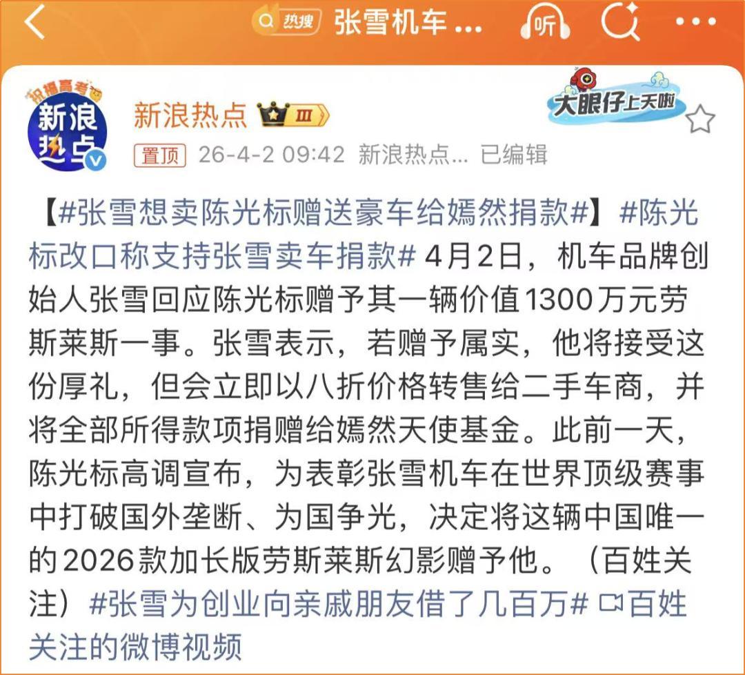 陳光標想贈送一輛價值1300萬元的勞斯萊斯給他,他公開表示,如果真送的話,他將會以8折賣掉,然後全部捐給嫣然天使基金。