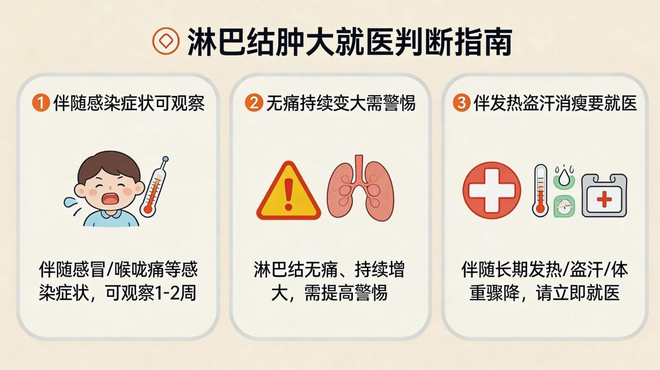 - 如果腫大是無痛性、進行性的(不痛但持續緩慢變大),質地堅硬、固定、不滑動,或者出現在鎖骨上方,就需要高度警惕,建議儘快就醫排查。