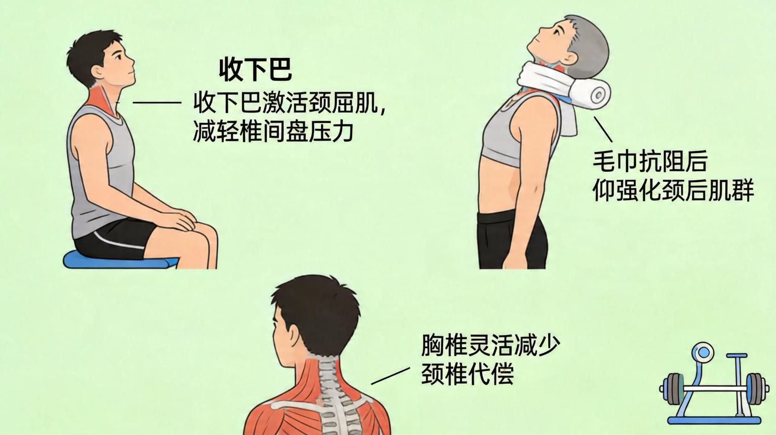 - 針對性的康復訓練是核心:這不僅僅是活動脖子。比如,可以練習“收下巴”動作(坐直,水平向後輕柔移動頭部,如同做出雙下巴),這能激活深層的頸屈肌,減輕椎間盤壓力。也可以利用毛巾進行抗阻後仰,強化頸後肌羣。別忘了胸椎和肩背的訓練,一個靈活的胸椎能減少頸椎的代償勞損。
