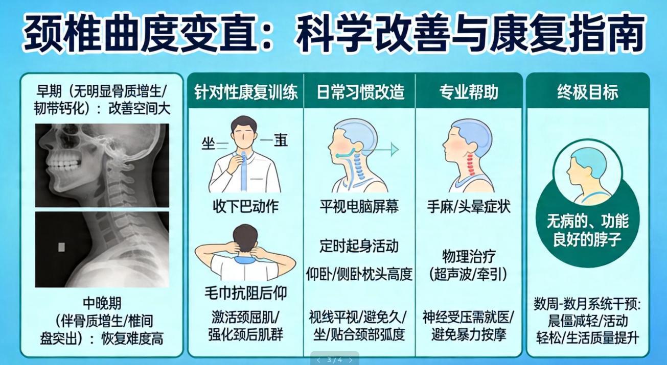 年齡和病程是關鍵。年輕人的頸部肌肉和韌帶彈性好,如果是因爲近幾個月不良習慣導致的“功能性”曲度改變,通過持之以恆的科學矯正和鍛鍊,有很大機會讓曲度得到相當程度的恢復,症狀也能明顯消除。而對於中老年朋友,或是已經伴有骨質增生、椎間盤突出的“結構性”改變,完全恢復到理想的生理曲度往往比較困難。但請不要灰心,治療的重點可以放在有效緩解不適、增強頸椎穩定性、延緩退化速度上,這同樣能極大提升生活質量。