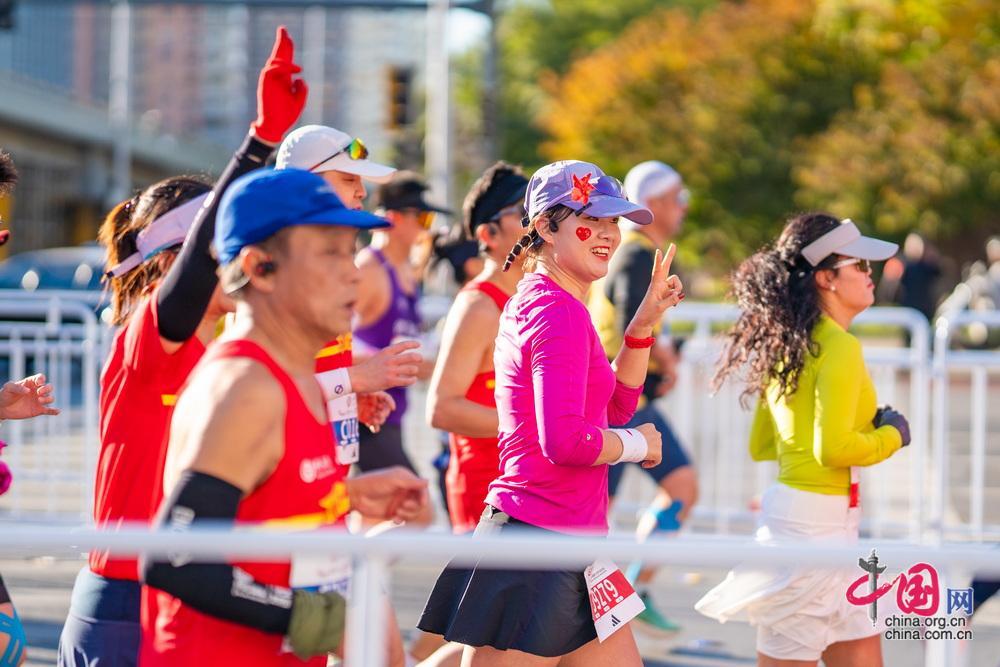 11月2日,2025北京馬拉松在北京天安門廣場鳴槍起跑,一名跑者面對鏡頭展示自己。中國網記者 鄭亮攝