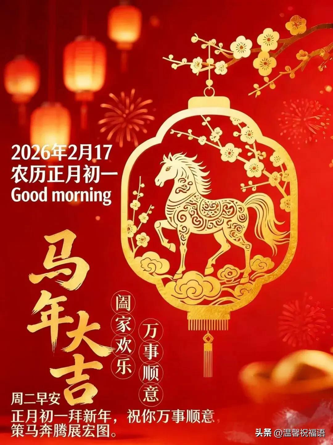 大年初一,給您拜早年!願平安罩着您,喜氣跟着您,福氣粘着您!馬年吉祥!