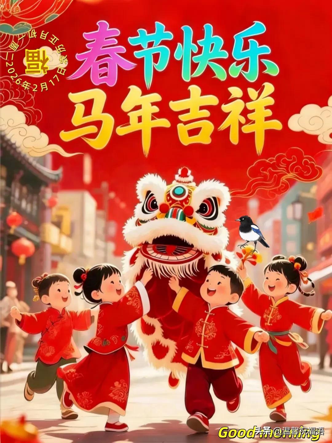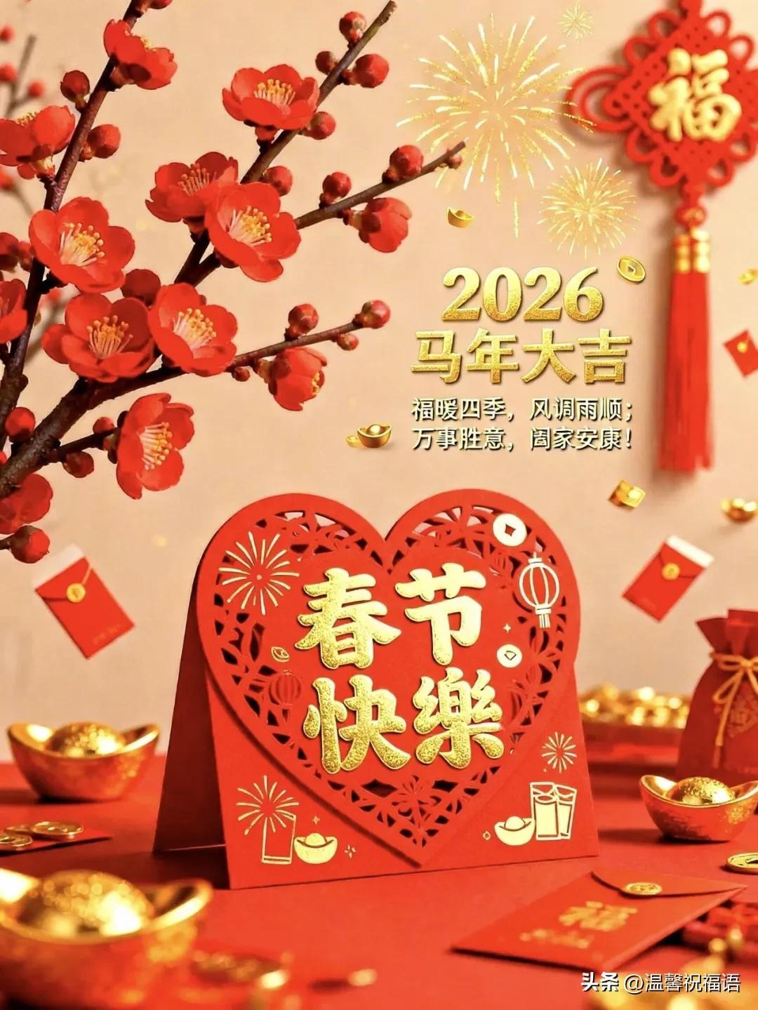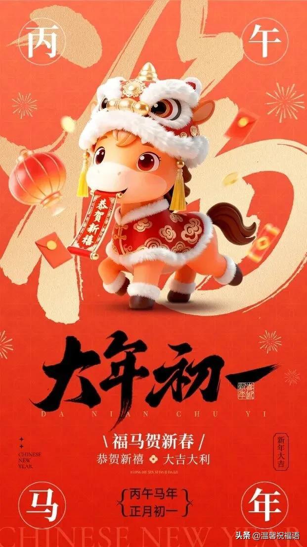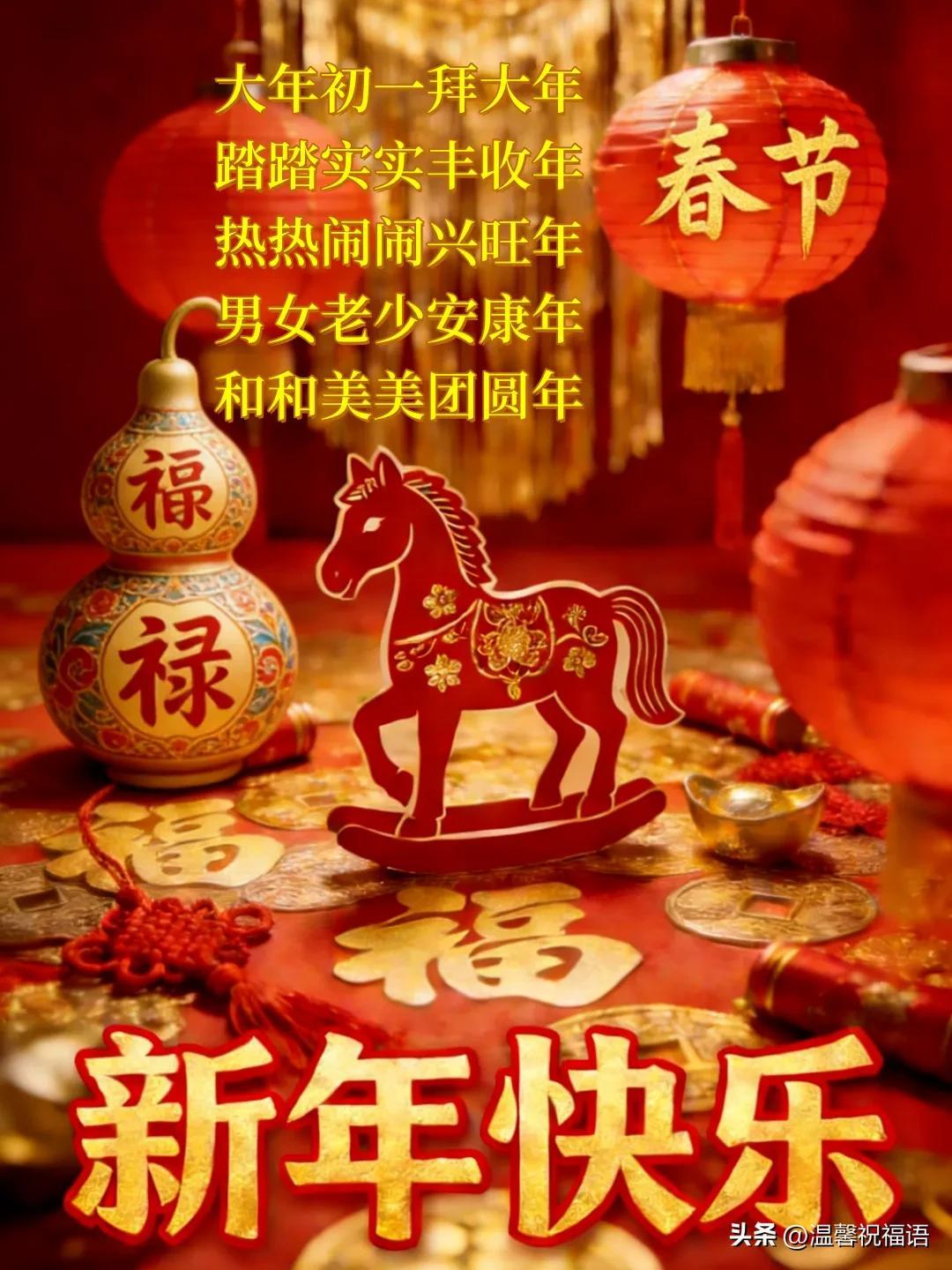 13、初一送福到君旁,喜氣洋洋過大年。願您馬年展宏圖,事業順利耀乾坤。閤家歡樂迎新春,萬事如意福臨門。新春快樂無限好,幸福生活比蜜甜。