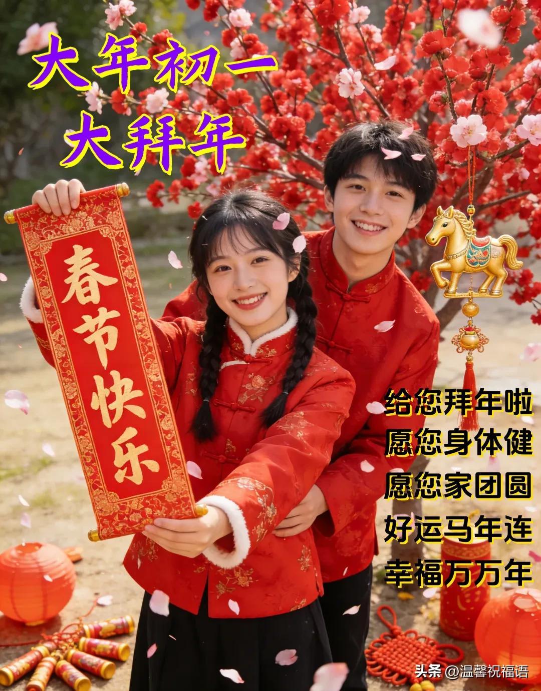 9、初一拜年笑聲揚,幸福圍繞在身旁;春風得意馬蹄疾,願你新年更順利;吉星高照人歡喜,好運綿綿福相依;願你歲歲平安吉,年年如意春滿溢。