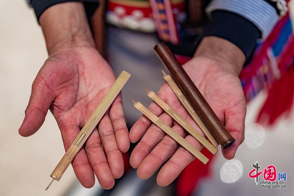 全國人大代表、怒族非遺傳承人鬱伍林展示民族傳統樂器。中國網記者 鄭亮攝
