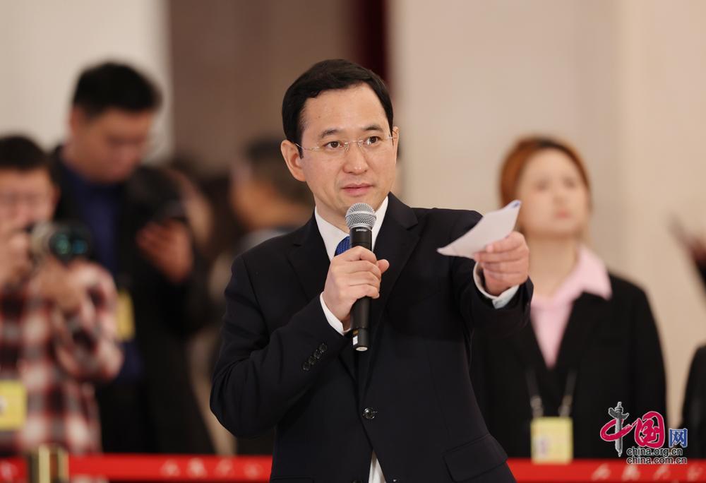 十四屆全國人大四次會議新聞中心主任、全國人大常委會辦公廳新聞局局長金晴中主持“代表通道”集中採訪。中國網記者 董寧攝影