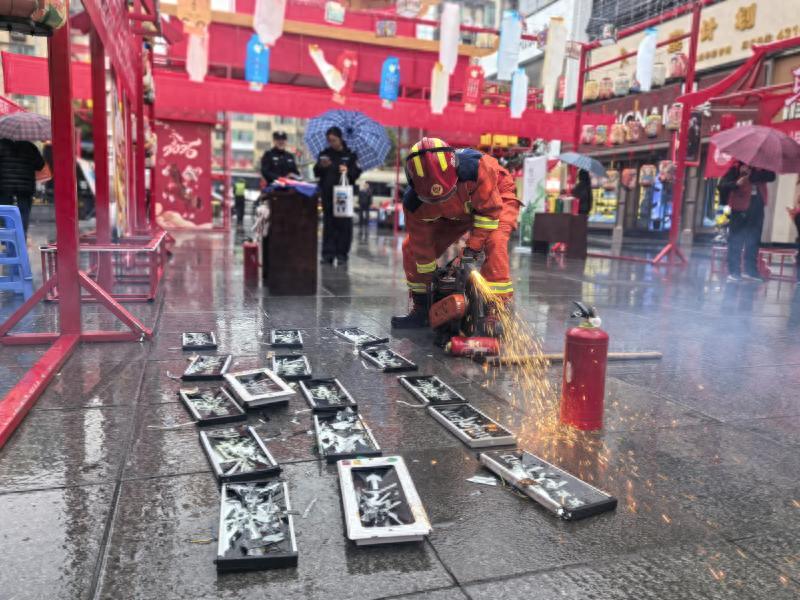 在電影院步行街活動現場,一一陳列着近期查獲的不合格滅火器、應急照明燈具、疏散指示標誌、自救呼吸器等假冒僞劣消防產品。隨着銷燬指令下達,消防員使用無齒鋸、液壓鉗、消防斧等專業設備,對僞劣產品進行切割、破拆、碾壓,全程規範操作,確保銷燬徹底,杜絕二次流入市場,以實際行動彰顯了消防部門嚴查僞劣產品、守護民生安全的堅定決心。