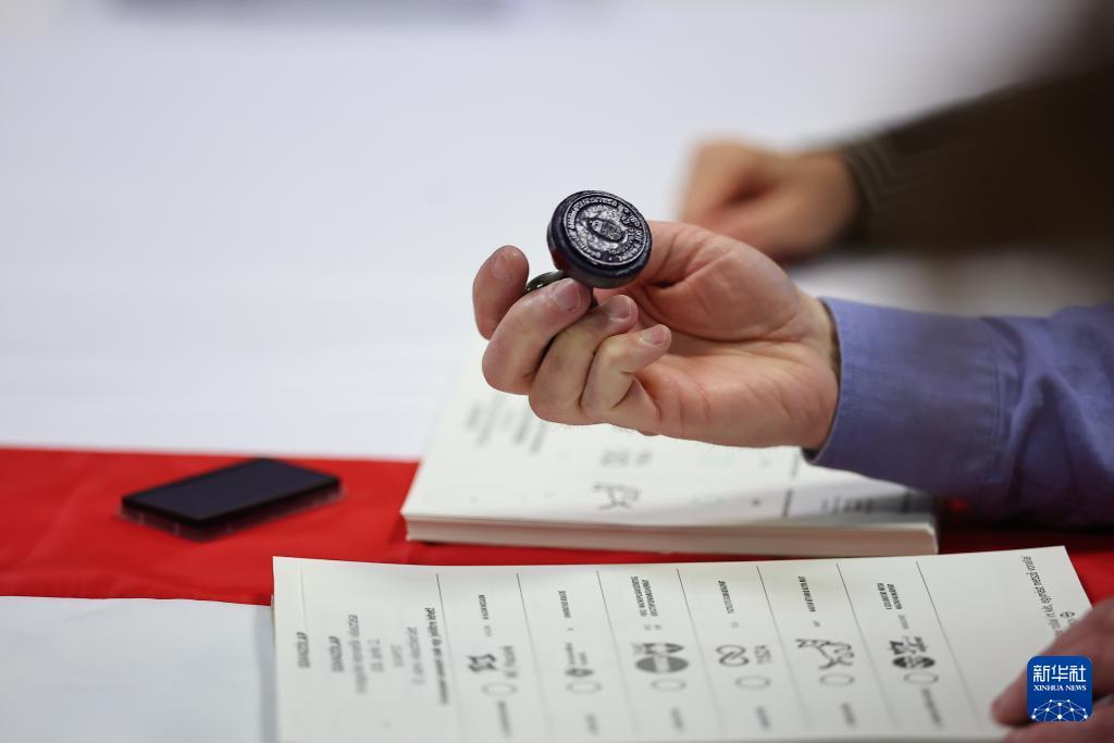 4月12日,在匈牙利布達佩斯,一名工作人員在一處投票站爲選票蓋章。