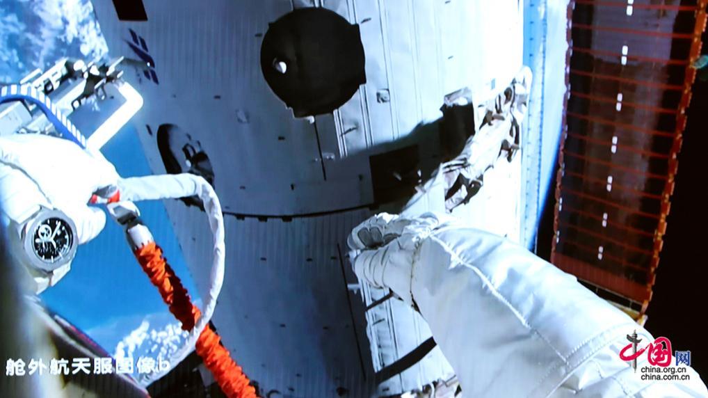 這是4月17日在北京航天飛行控制中心屏幕上拍攝的神舟二十一號乘組航天員武飛在艙外工作的畫面。中國網發 張帆 攝影