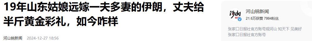 信源1:河山銳新聞 2024-12-27 18:56 《19年山東姑娘遠嫁一夫多妻的伊朗,丈夫給半斤黃金彩禮,如今咋樣》