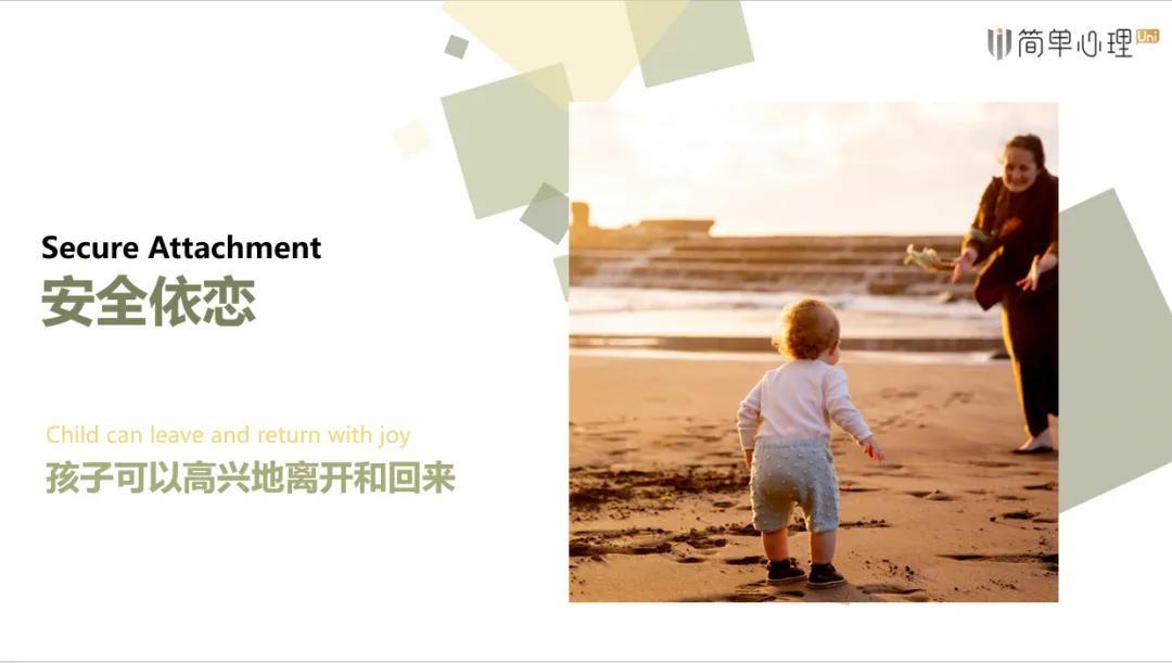 安全依戀的孩子會對分離表現出苦惱,試圖去找媽媽。當媽媽重新回來的時候,他們又能很親近媽媽,並且很快就能平靜下來,不會有長時間的沮喪。