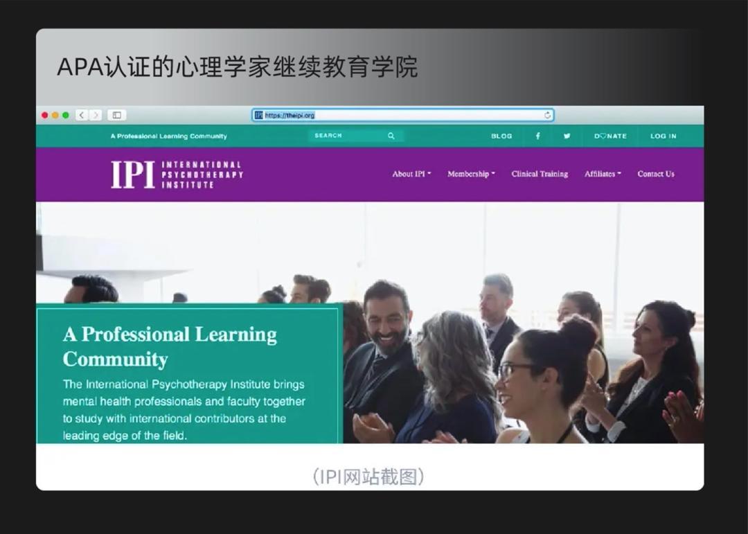心理治療研究院(IPI)是美國心理學會(American Psychological Association, APA)和美國諮詢師認證管理委員會(National Board for Certified Counselors,NBCC)認證批准的心理學家繼續教育學院(ACEP No.6017)。