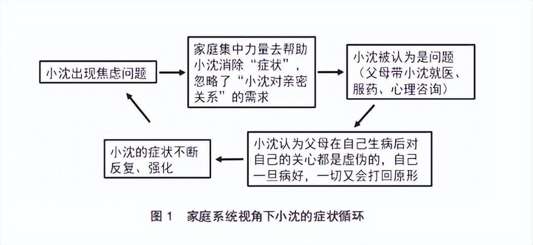 結合小沈的成長經歷以及和家庭成員的互動模式,我有了一個大膽的猜測。當把小沈反覆出現的焦慮問題放在家庭系統的視角下,我發現在小沈的身上或者在他的家庭中存在以下的症狀循環(見下圖1),小沈被“困”在症狀循環中,不願意或不敢讓自己好起來。小沈的問題症狀是家庭成員相互作用的結果,小沈並不是問題,家庭系統本身才是問題,需要家庭合力,打破小沈的症狀循環。