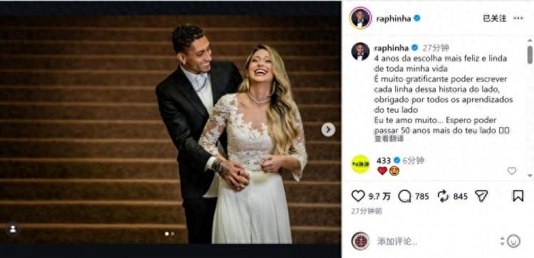 拉菲尼亞社媒寫道:“這是我一生中最幸福、最美好的選擇,轉眼已四年。