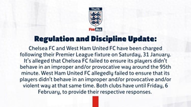 英足總髮布監管與紀律更新公告:針對1月31日週六英超聯賽中的行爲,切爾西足球俱樂部與西漢姆聯足球俱樂部已遭到指控。