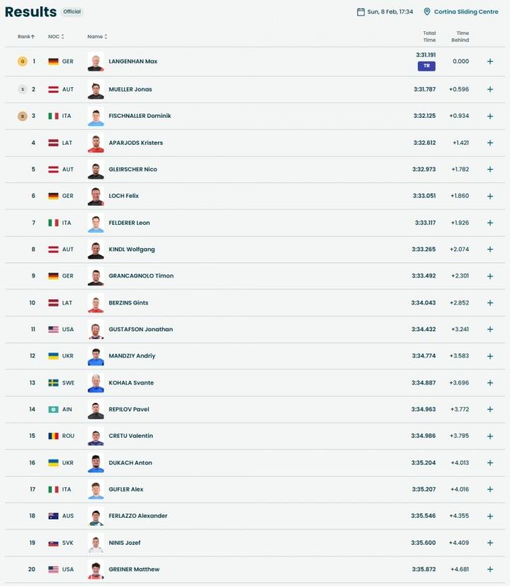 奧地利選手約納斯・穆勒獲得亞軍,中國選手鮑振宇最終位列第24名,追平中國男子雪橇項目的冬奧會最好成績。