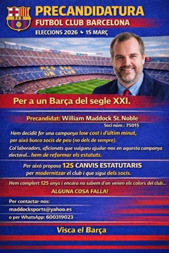作爲巴塞羅那的企業家和長期會員,威廉·馬多克以獨立候選人的身份參選,其競選綱領結合了機構改革和歷史訴求。等待他的是收集2337個簽名的門檻,他的出現爲這場自1953年以來的第十五次選舉帶來了意外元素,將決定未來幾年巴塞羅那俱樂部的方向。