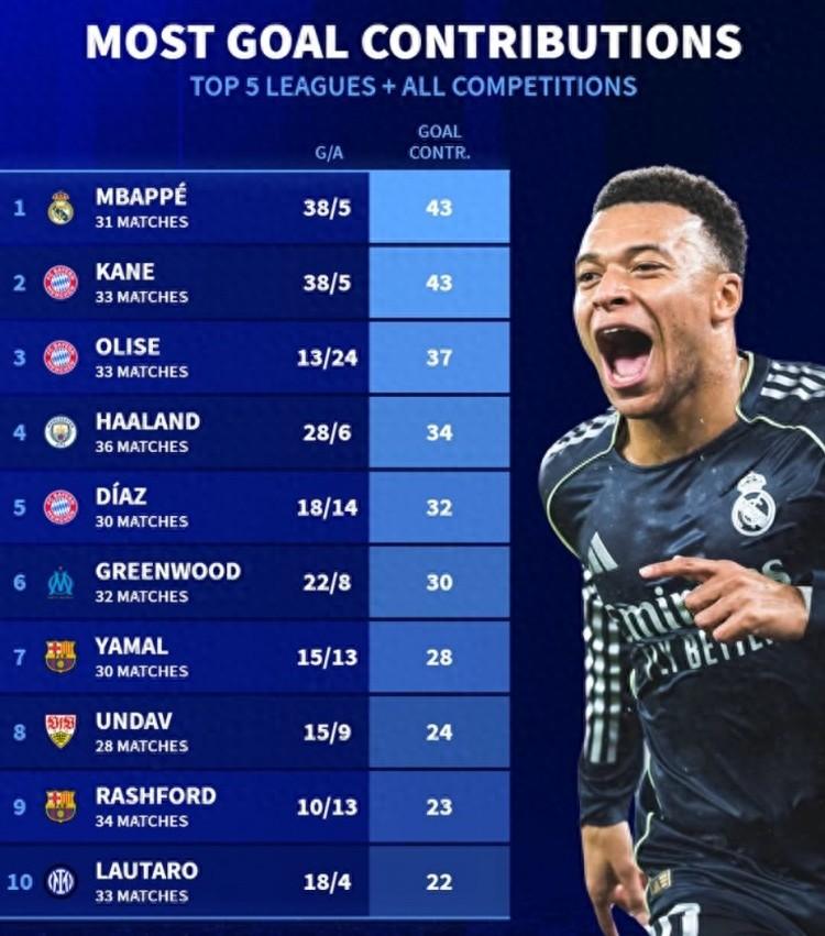 1. 姆巴佩(皇馬),31場,38球+5助攻=43球