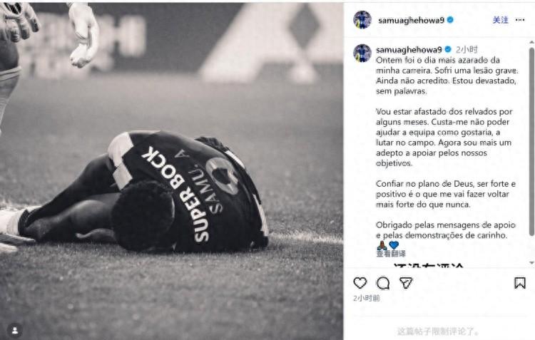 2月11日訊 波爾圖前鋒阿格霍瓦右膝扭傷,伴有前交叉韌帶損傷,他在社交媒體上發文,談到了自己的傷情。