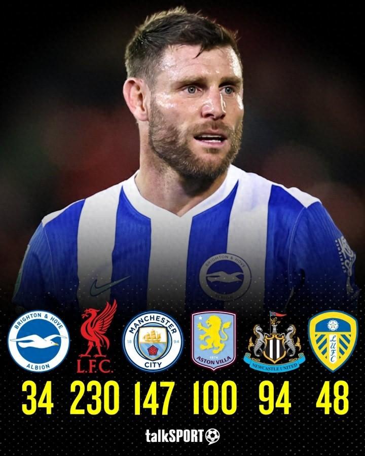 至今爲止的24年生涯中,米爾納共效力過利茲聯、紐卡斯爾聯、阿斯頓維拉、曼城、利物浦、布萊頓6支英超球隊,在此前652場英超比賽中貢獻56粒進球和87次助攻,3次獲得英超冠軍。