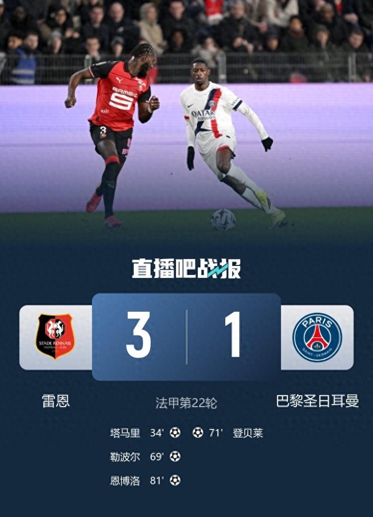 2月14日訊 北京時間2月14日凌晨2時,法甲第22輪,巴黎做客雷恩公園球場對陣雷恩。上半場,杜埃錯失單刀良機,隨後塔馬裏首開紀錄。巴黎半場0-1落後雷恩。下半場,勒波爾擴大領先優勢,登貝萊扳回一城,恩博洛破門。最終巴黎1-3不敵雷恩,終結了聯賽7連勝的勢頭。