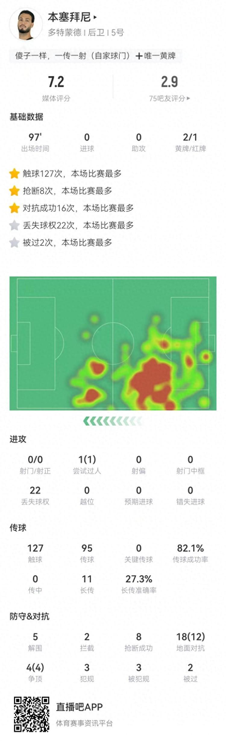 2月26日訊 多特蒙德在本輪歐冠附加賽次回合1-4不敵亞特蘭大,本塞拜尼堪稱“絕對主角”,本場數據如下: