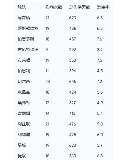 在傷病總次數方面,切爾西與熱刺情況最爲嚴重,兩支球隊均出現了24次傷病。雖然次數相同,但熱刺球員累計缺陣時間更長,達到713天,而切爾西爲645天。值得注意的是,紐卡斯爾雖僅有21次傷病,其球員總傷停天數卻高達722天,位居全聯盟之首,這表明該隊遭遇的多是長期傷病。