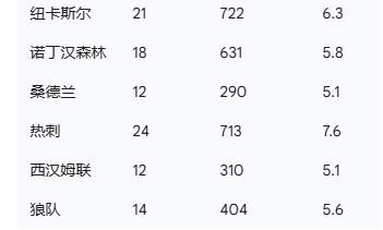 在傷病發生率這一關鍵指標上,利茲聯以9.0的數據排名第一,顯示出極高的球員損耗頻率。熱刺和伯恩茅斯緊隨其後,發生率均爲7.6。